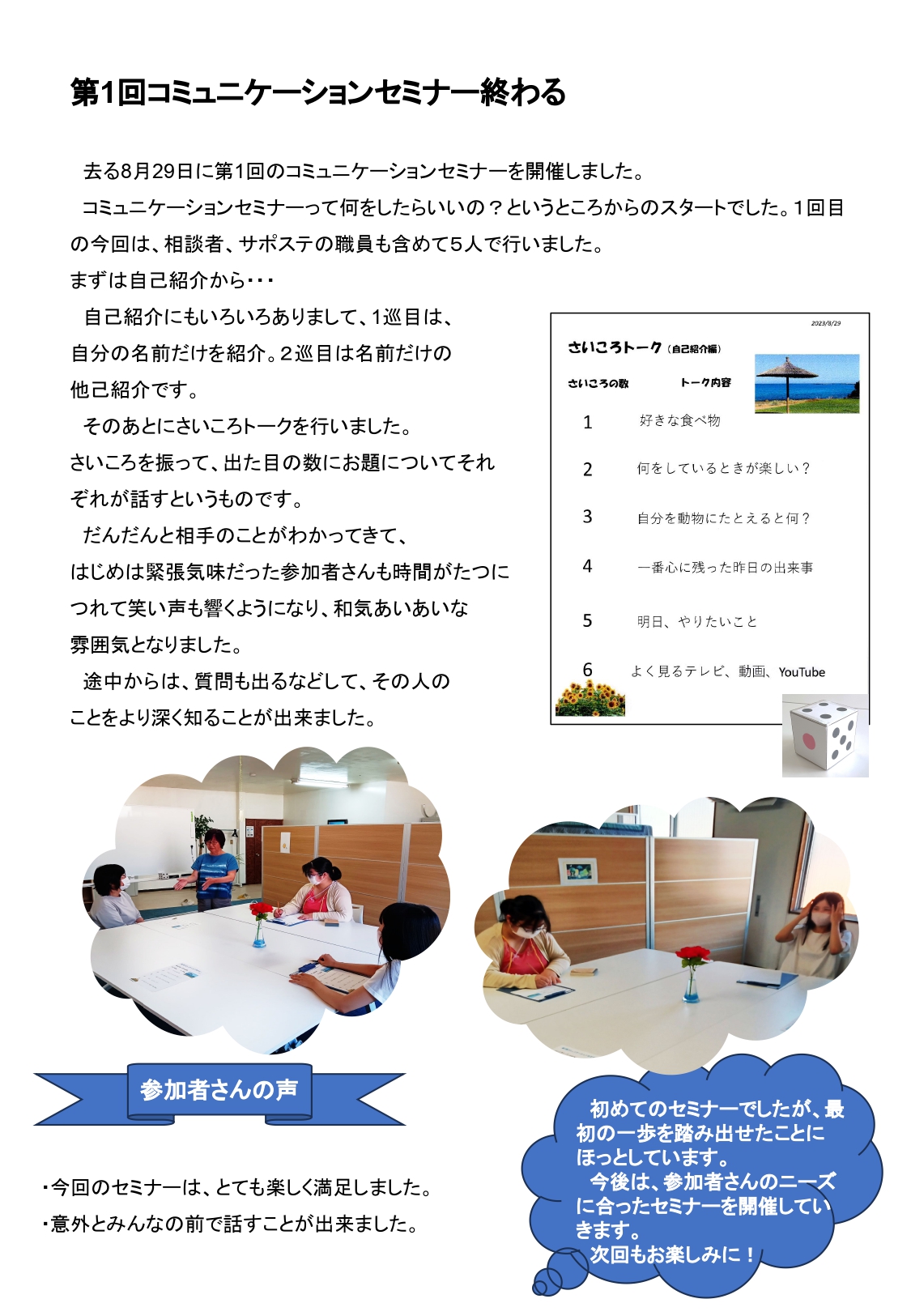 コミュニケーションセミナーって何をしたらいいの?というところからのスタートでした。1回目の今回は、相談者、サポステの職員も含めて5人で行いました。