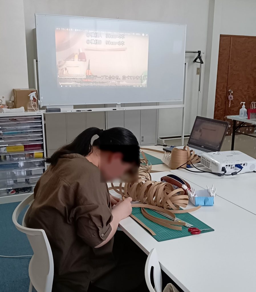 - クラフトテープを用いて夏用のバックを作りました。丸まっているクラフトテープをのばし、長さを何本測って切り、組み立てました。作業が途中で終わりましたので、来月もみんなで続きを頑張ります。